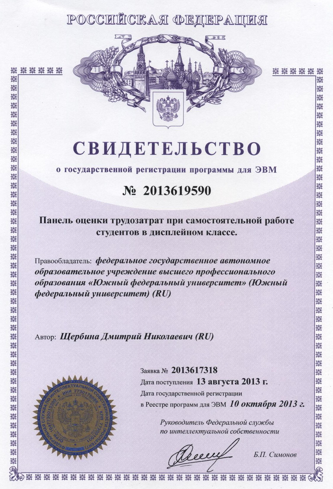 Свидетельство о государственной регистрации программы для ЭВМ № 2013619590 от 10.10.2013 г.