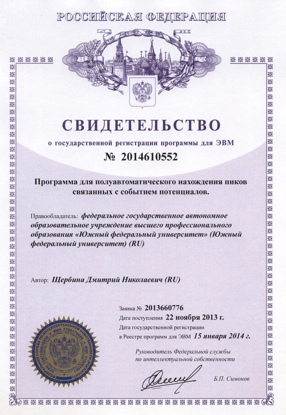 Certificate of state registration of the computer program #2014610552 at 2014-01-15