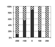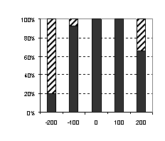 А - один испытуемый, Б - второй испытуемый. По оси абсцисс отложены варианты предъявления стимулов - цифра обозначает момент предъявления зрительного стимула относительно слухового в мс. По оси ординат - количество ответов в процентах: темные столбики - ответы "одновременно", штрихованные - "неодновременно".